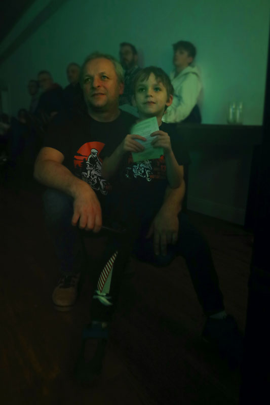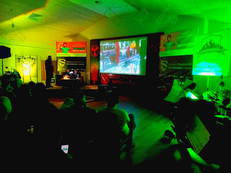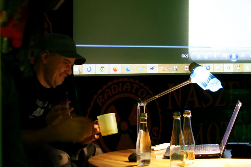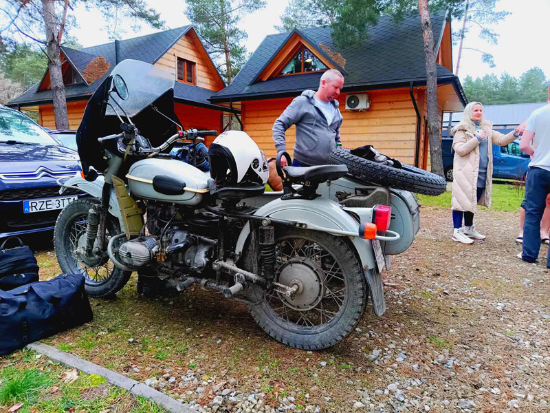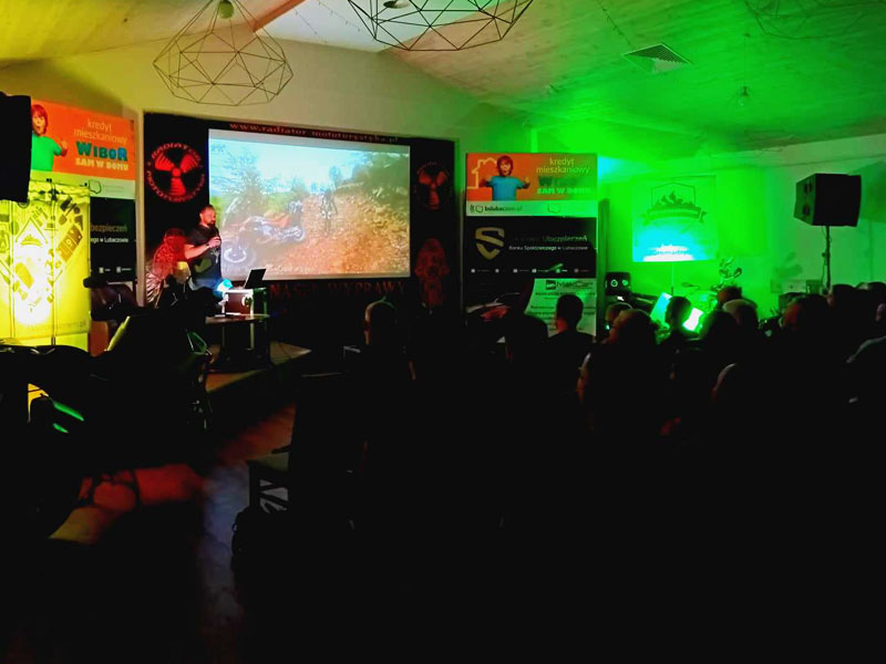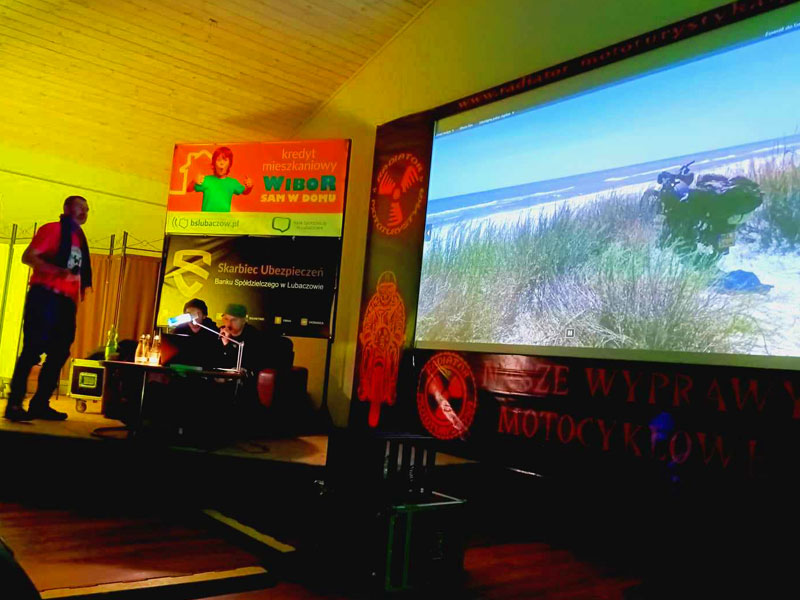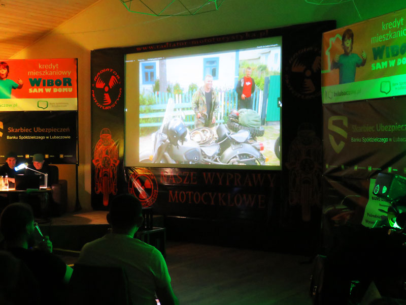 Po oddaniu mikrofonów Łukaszowi „LukS” Smagłowskiemu, Mateuszowi Śmigielskiemu i jego synowi Stanisławowi szybko wylądowaliśmy motocyklami z wózkami bocznymi w błocie. Zupełnie inny styl szukania przygód, które można znaleźć pod własnym domem i daleko od domu. Motocykle stare, wolne, awaryjne ale zawsze docierające do celów podróży. Było wolno, brudno i męcząco – jak to w błocie. Było też wesoło i pomysłowo. Na szczęście wózek boczny jest bardzo pojemny więc saperki i liny były w każdym i pomagały podczas najbardziej wymagających przepraw. Akcja wyprawy działa się nie tylko w Polsce ale również w krajach za naszą wschodnią i południową granicą. Opowieści dostarczyły słuchaczom szeregu ciekawych spostrzeżeń. Taki sposób podróżowania trzeba po prostu kochać. Takie trasy trzeba umieć wyszukać. Podczas takich wyjazdów trzeba przelać litry potu aby dojechać do celu. To była świetna przygoda z Nieformalną Świętokrzyską Grupą Motocyklową.