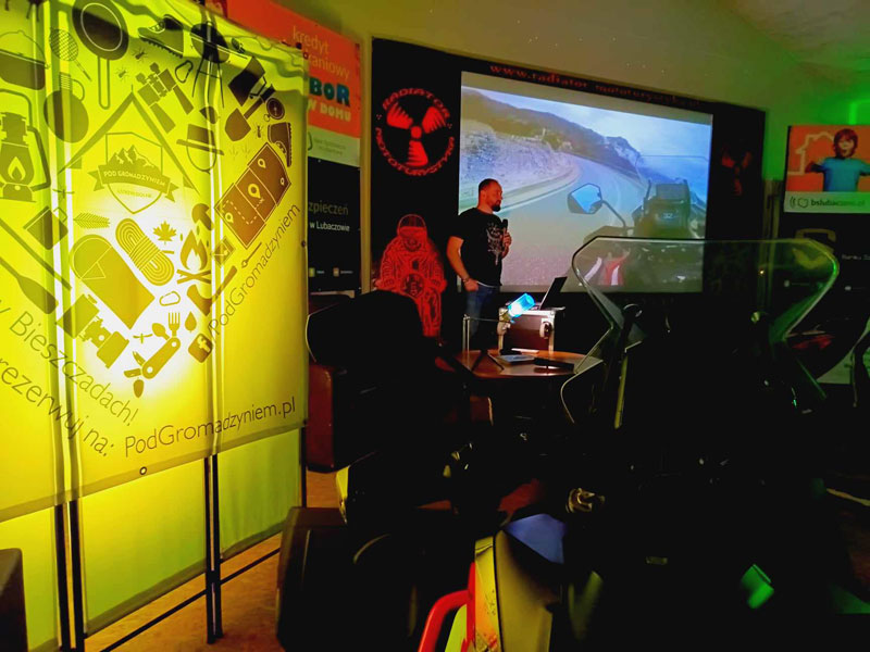 DZIEŃ I: Pierwszy dzień wydarzenia rozpoczęliśmy od krótkiego „wprowadzenia” dla nowo przybyłych wielbicieli podróży i zarazem uważnych słuchaczy. Wydarzenie zaczęło się w piątkowy wieczór – 23 lutego 2024 roku. Łaskawy i ciepły miesiąc luty pozwolił jednemu z prelegentów oraz wielu uczestnikom przyjechać na swoich motocyklach.