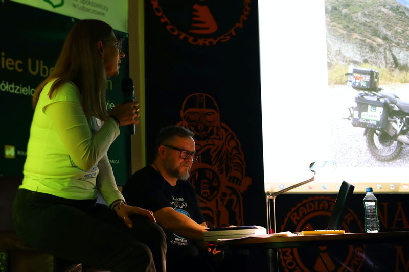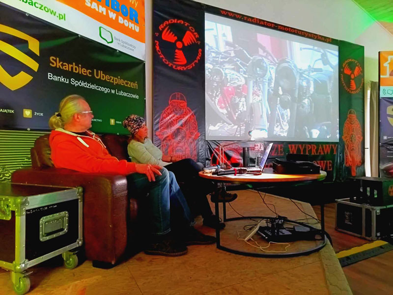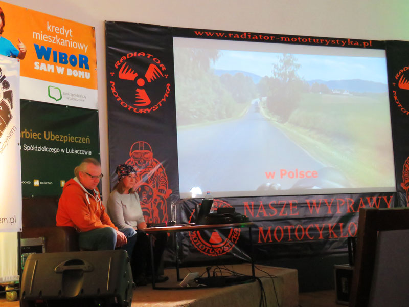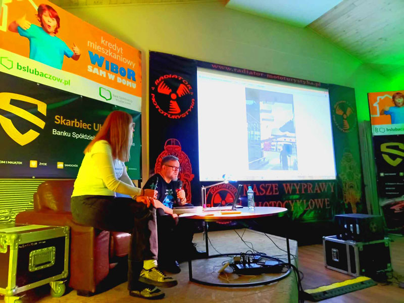 Grazia i Tomek, czyli Grażyna i Tomek Sobolewscy opowiedzieli podczas swojej prezentacji o innej specyfice podróżowania motocyklem z wózkiem bocznym. Tak jak w piątek zaczęliśmy opowieści z podróży starymi motocyklami, takim też sprzętem ruszyliśmy w dalszą podróż – w drugi dzień – do Chorwacji i Rumunii. Prezentacja z podróży przeplatana nagraniami podczas wywiadów antenowych w radiu była odmienna od dotychczasowych. Relacja filmowa z mapami z trasy i całym wachlarzem przygód towarzyszących w podróży „bez celu”. W sumie celem była Gruzja, jednak plany planami a życie życiem. Raz była Chorwacja, innym razem Rumunia. Podróż z pominięciem atrakcji obleganych przez turystów, jazda bocznymi szlakami. A jednak motocykl marki Ural M63 „rusek” produkcji 1969 okazał się godzien zaufania i przejechał wiele tysięcy kilometrów bez większych awarii przez Słowację. Węgry, Serbię oraz Bośnię. Dużo miejsca poświęcono podczas prezentacji Chorwacji – kraju pachnącym słońcem i lawendą położonym na malowniczym półwyspie bałkańskim. Nasi goście zjechali go od Zadaru po półwysep Peljesac delektując się fascynującymi górami, klimatycznymi miasteczkami i malowniczymi drogami a szczególnie przełomami górskich rzek.