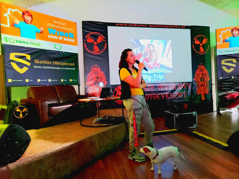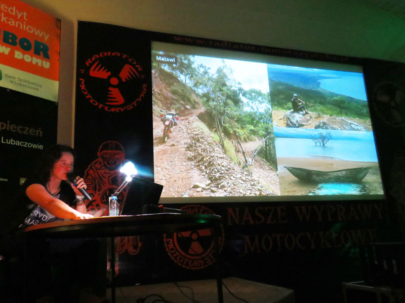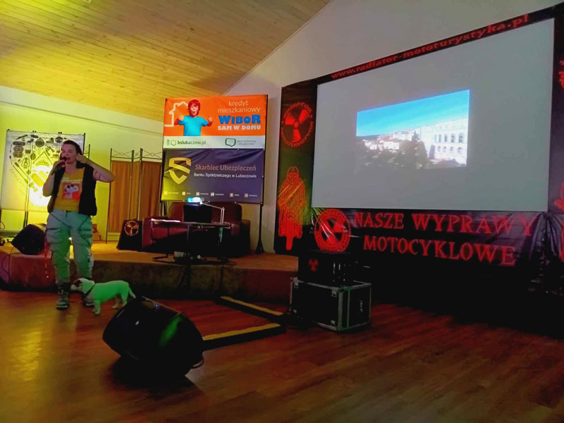 Po przerwie obiadowej m.in. na golonkę wróciliśmy do kolejnej prezentacji. Galyna Gałka przyjechała do nas z chorym synem Danielem, który leżał w łóżku a my słuchaliśmy o dość niszowej formie podróżowania – matka, syn i pies. Prezentacja przybliżyła nam cały charakter podróży z dzieckiem: „Ja chcę to, ja chcę tam…” „A dlaczego?” Jakby tego było mało, do marudzącego dziecka dołącza jeszcze piesek, który też ma swoje wymagania. Podróż z pieskiem możliwa była dzięki jego małym gabarytom. Zwierzak podziwiał krajobrazy wyciągając głowę z motocyklowej torby podróżnej zakładanej na bak motocykla, a kiedy wiało nudą zwijał się ciepłą kuleczkę i szedł spać. Wszystko byłoby proste ale piesek potrzebował przerw na picie i potrzeby fizjologiczne a podróż była możliwa z uwagi na porę roku – wiosna. Letnie podróże odbywały się już bez pieska. Poznaliśmy jednak receptę na podróż z psem na motocyklu podczas upałów na południu Europy i uciążliwych chłodów w Skandynawii. Relacja z podróży przez Bałkany, włoskie Alpy oraz Hiszpanię i Portugalię była ciekawą opowieścią o „dojrzewaniu” dziecka do podróży. Z wyjazdu na wyjazd Daniel z niesfornego i nieznośnego dzieciaka przeistoczył się w chłopca ceniącego sobie możliwość podróżowania na motocyklu. Ciągle rośnie, dojrzewa i z pewnością miałby sporo do powiedzenia, gdyby nie gorączka. Można? Można! Wystarczy tylko chcieć.
