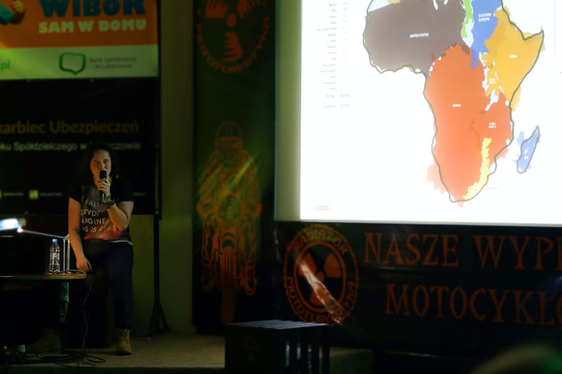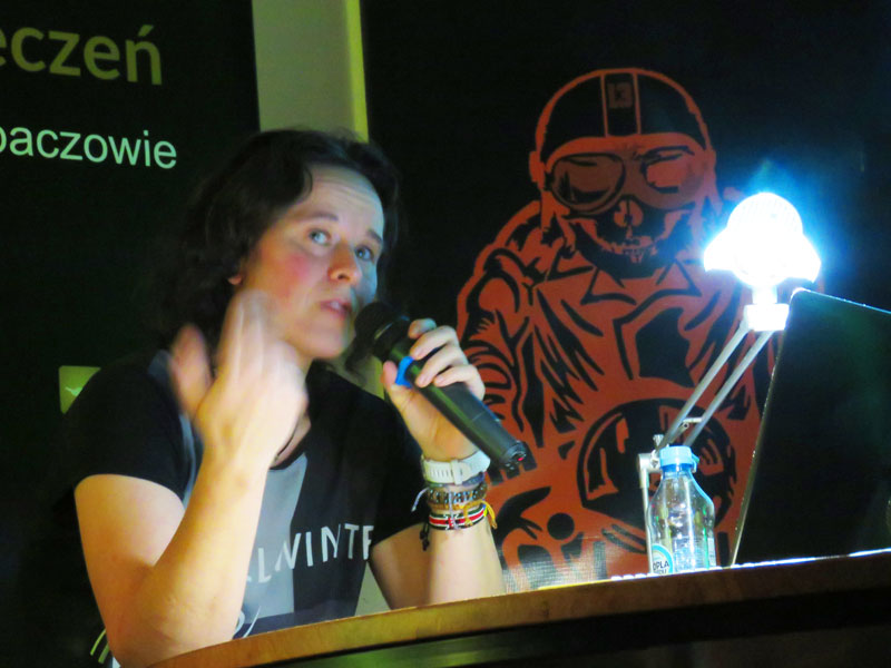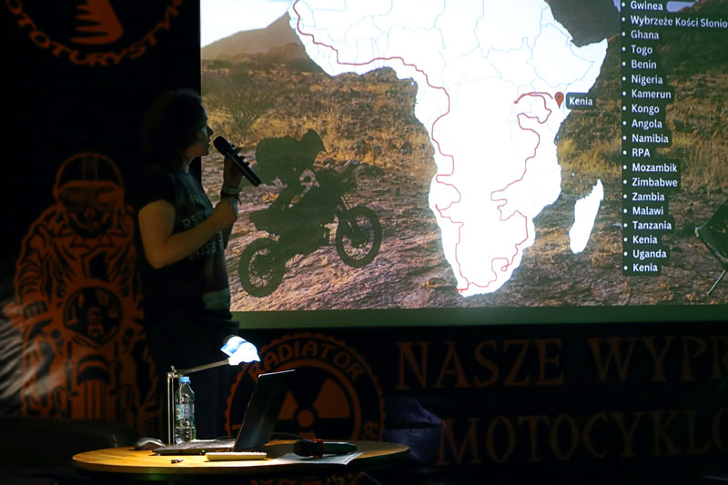 Z Azji przenieśliśmy się do Afryki, o której opowiadała nam Anna Żak. Ania okazała się wytrawnym travelerem, bo jak inaczej postrzegać samotną kobietę w podróży na motocyklu, która z przygodami objechała CAŁĄ Afrykę. Jakby było mało podróż Ani dookoła Afryki jest jedynie fragmentem projektu realizowanej od 2016 roku motocyklowej podróży dookoła świata. 42 miesiące w podróży, ponad 160 000 km. Podróż przez czarny ląd i drugi pod względem wielkości kontynent na świecie, to nie lada wyzwanie. Kraje podzielone sztucznymi granicami borykające się licznymi konfliktami, w tym plemiennymi – to istna mieszanka wyznań, kultur i dysproporcji. Bogactwo i bieda, piaski pustyni, sawanny, ginące gatunki zwierząt chronionych w rezerwatach… Najdalej wysunięty na południe punkt Afryki – Przylądek Igielny, to ulubione miejsce polowań rekinów. Trudno zmieścić ponad roczną podróż po Afryce w krótkiej prezentacji i jeszcze krótszej opowieści, jednak Ania tego dokonała. Z zamiłowania do gór Ania chwilami porzucała swój motocykl. Pieszo wspinała się na 5000 m n.p.m. i wielokrotnie zaliczała większość ciekawych szczytów pojawiających się na jej trasie. Wiele nocy samotnie spędzonych w namiocie, tam gdzie pozwalały na to warunki, to też nie lada wyzwanie. Największym zagrożeniem w Afryce, czy na innych kontynentach nie są jadowite owady, czy zwierzęta, tylko ludzie. Podsumowując Ania przejechała przez Afrykę przejechała 60 000 kilometrów z małym bagażem. Miała ze sobą wszystko co najbardziej potrzebne, również klucze niezbędne do naprawy motocykla. Można? Można!