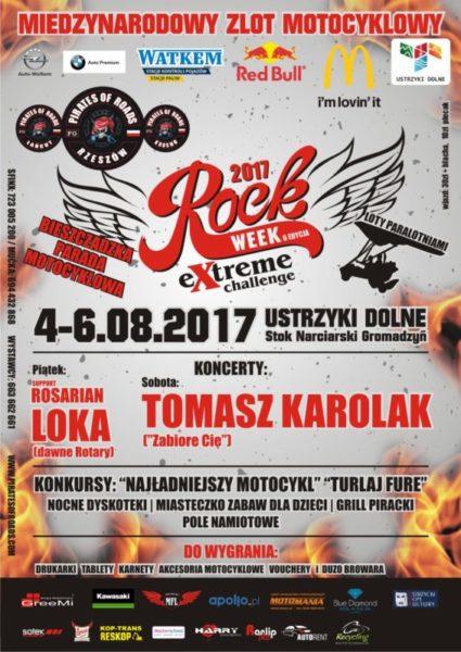 "Klub Motocyklowy Pirates Of Roads Rzeszów chciałby Państwa zaprosić na 6 Międzynarodowy Zlot Motocyklowy Rock Week Extreme Challange w Stolicy Bieszczad. Mimo nie sprzyjającej aury pogodowej w 2016 roku Ustrzyki Dolne, dzięki powyższej imprezie odwiedziło prawie 10 000 osób dzięki czemu ta impreza stała się jedną z największych imprez w południowo wschodniej Polsce. W tym roku impreza organizowana jest w dniach 04-06.08.2017. Wszystko wskazuje na to , że będzie to kolejny rekordowy rok jeżeli chodzi o frekwencję"